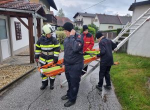 Übungsannahme war ein Wirtschaftsgebäudebrand mit zwei vermissten Personen und eine verletzte Person auf einem Hausvordach.