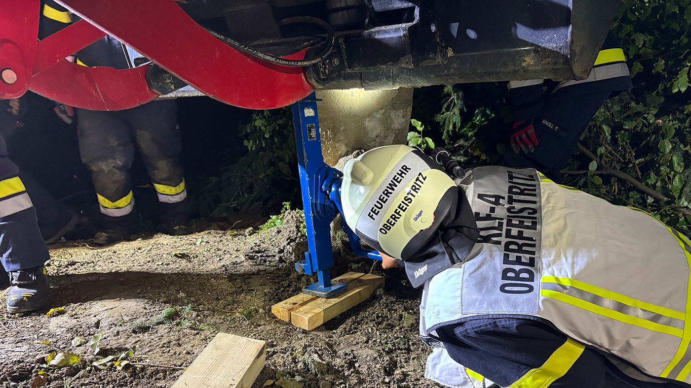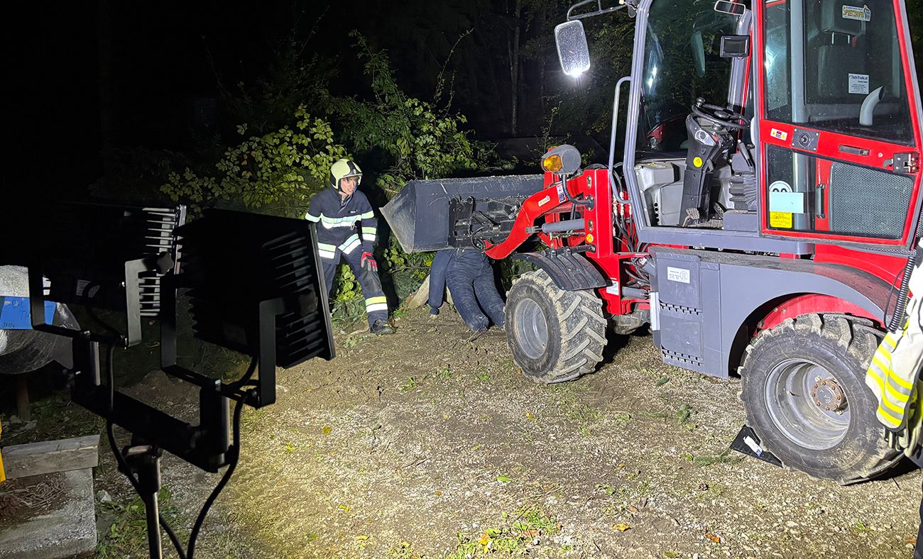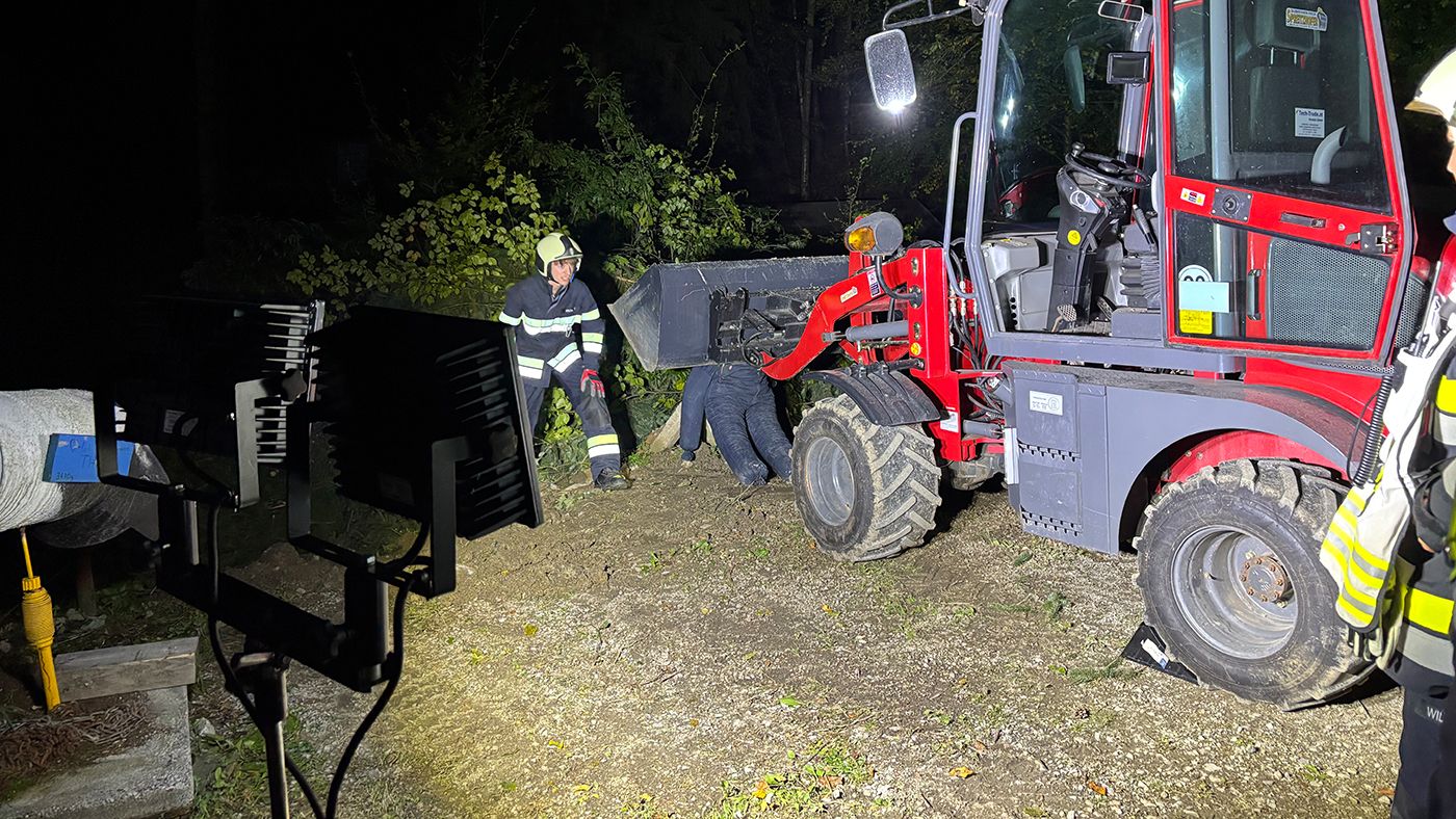 Mittels Südbahnwinde wurde der Kompaktlader angehoben und die Person unter der Schaufel konnte befreit werden.